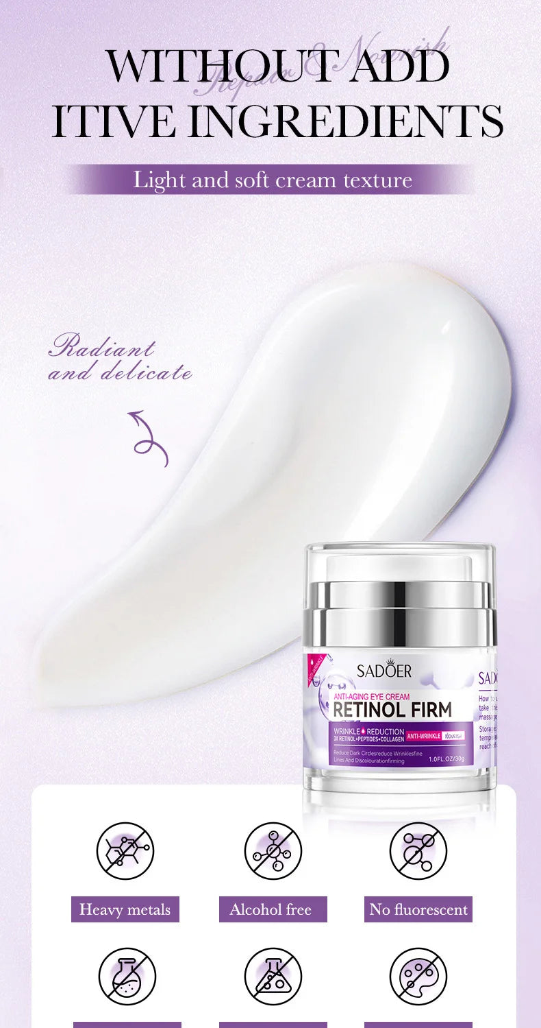 Sadoer Retinol Brightening Eye Cream is a powerful under-eye treatment formulated to reduce dark circles, puffiness, and fine lines. Infused with retinol and nourishing ingredients, it revitalizes tired eyes, leaving the skin around them smoother, firmer, and more radiant. Perfect for daily use, it helps restore a fresh, youthful appearance.